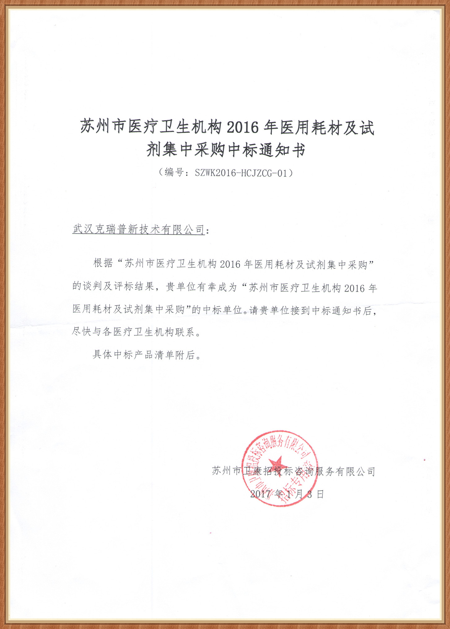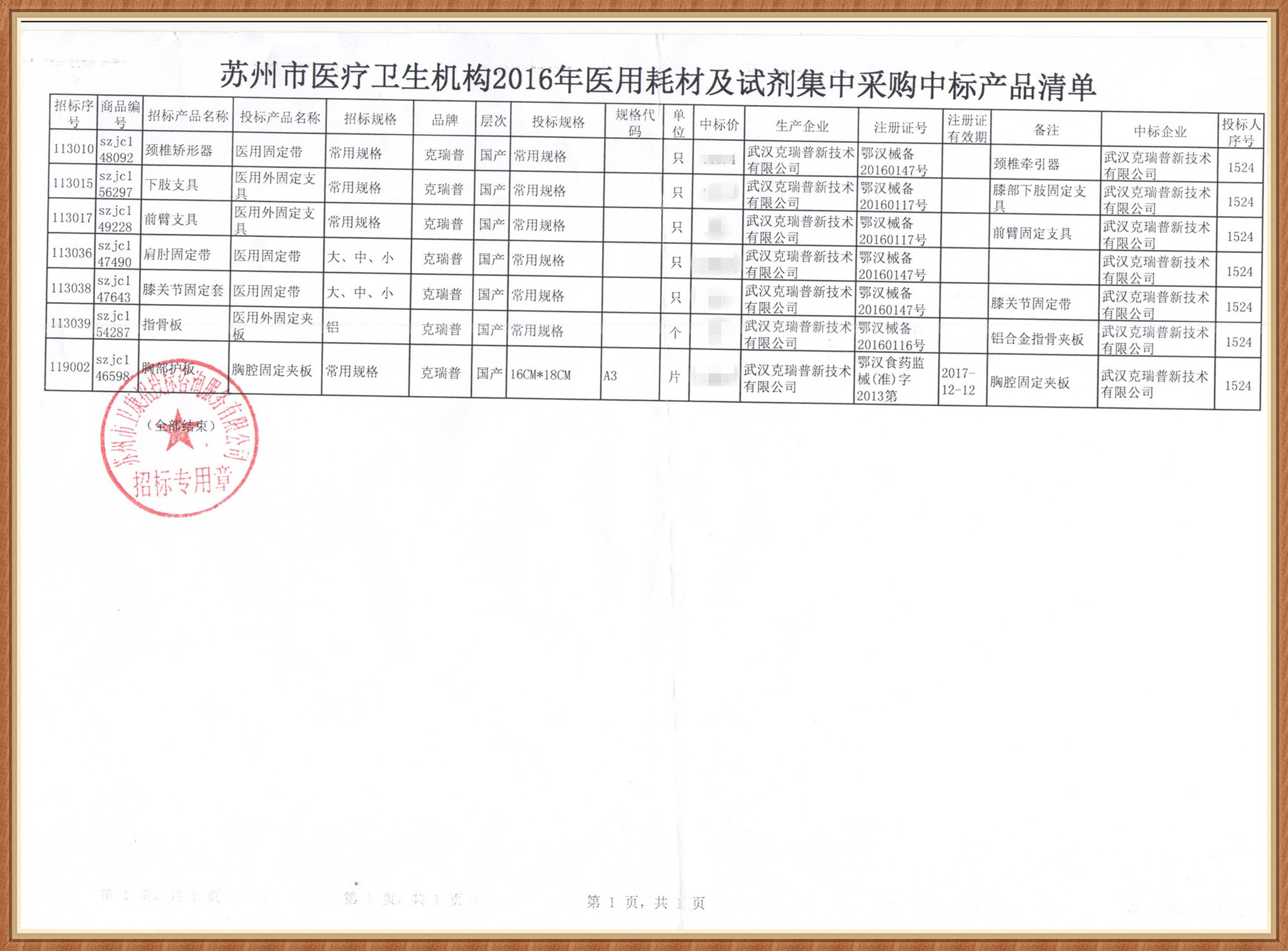 【江蘇省蘇州市醫(yī)療衛(wèi)生機構2016年醫(yī)用耗材及試劑集中采購中標通知書】我們武漢克瑞普新技術有限公司很有幸的在蘇州市醫(yī)療衛(wèi)生機構2016年醫(yī)用耗材及試劑集中采購招標中我們成功中標了,那么我們這次中標的產品有胸部護板、指骨板、膝關節(jié)固定套、肩肘固定帶、前臂支具、下肢支具及頸椎矯形器等骨科耗材產品,我們的產品種類較為多樣歡迎各大經銷商與我們聯(lián)系。